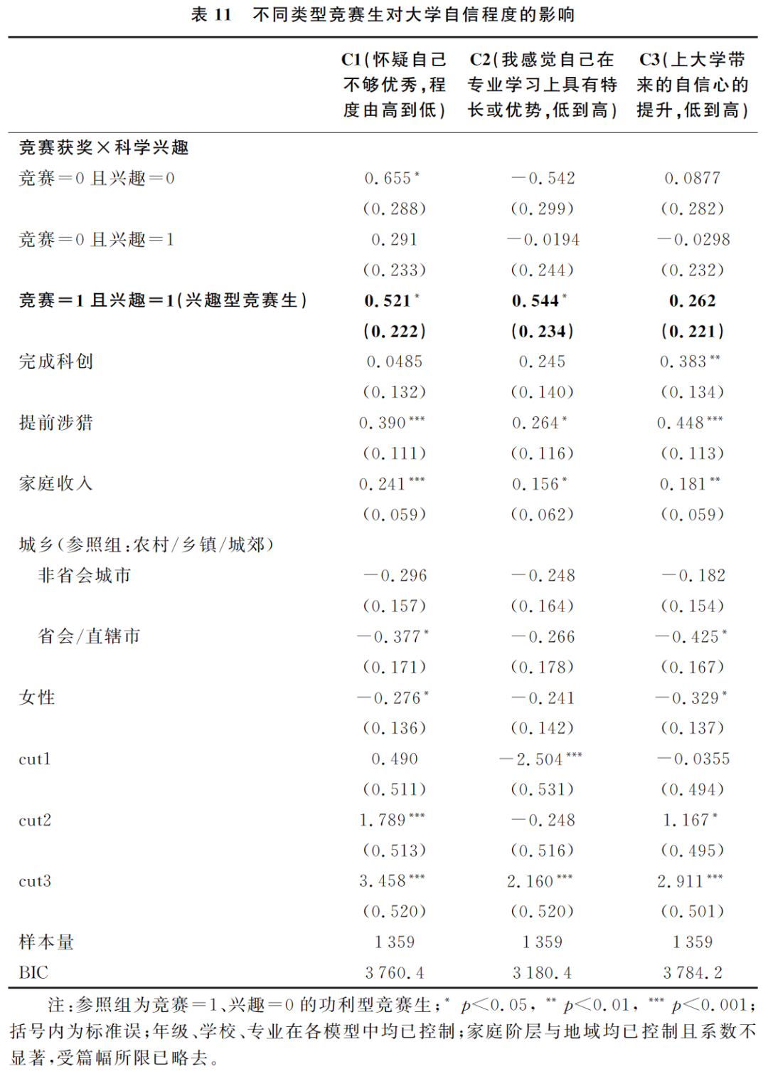 那麼,興趣型與功利型競賽生在自信方面的表現有何差異?如表11所示,興趣型競賽生顯著更堅信自己足夠優秀,也更相信自己在基礎理工科專業學習上有更強的天賦與能力。功利型競賽生對自己不夠優秀的懷疑程度甚至高於中學時對科學沒有熱情、也沒有參加競賽或多次獲獎的學生。