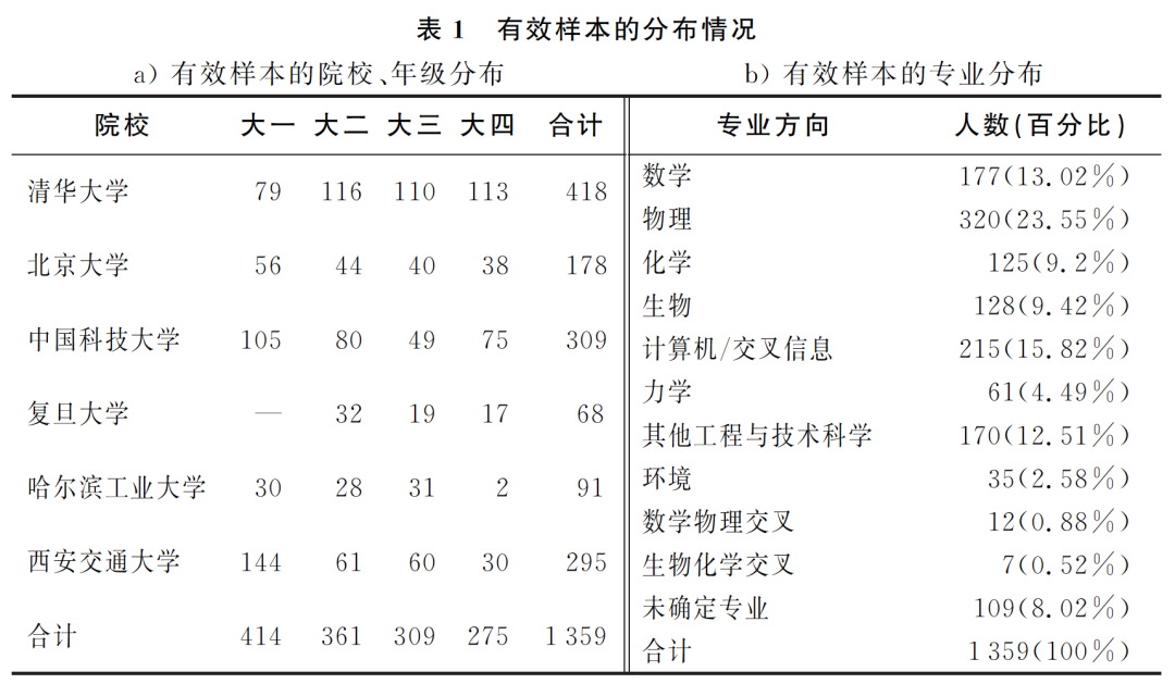 本文使用“全國頂尖大學基礎學科拔尖學生調查”數據,調查對象包括清華大學學堂班和星火班學生、北京大學教育部基礎學科拔尖計劃學生、復旦大學教育部基礎學科拔尖計劃學生、中國科學技術大學少年班學院學生、西安交通大學錢學森學院學生與哈爾濱工業大學英才學院學生。調查於2017年秋季至2018年春季的一學年內實施,對這些院校相應項目在校生採取全樣本發放問卷,總回收率在70%以上,共採集到1359份有效樣本。樣本描述統計見表1。調查樣本涵蓋了當前中國最頂尖大學中被高度傾注教育資源和培養期望的基礎理工科學生羣體,具有較好的代表性。