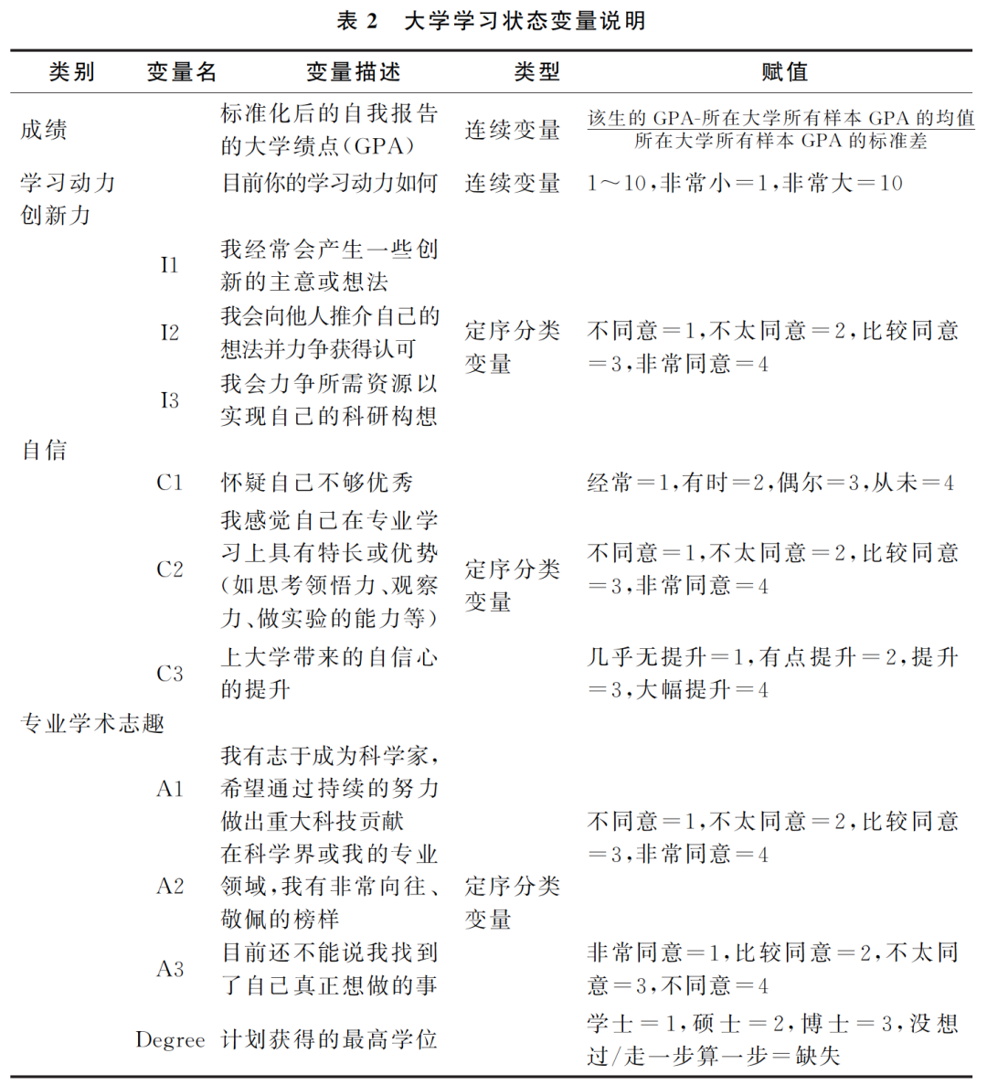 在我國,具有拔尖創新人才培養特色的學情問題應有以下幾個側面。首先,學習成績是表徵學習狀態的一般常用指標。能否形成自己的“學術志趣”是拔尖創新人才成長的關鍵。[15]學習中的心理狀態和自我概念是研究拔尖創新人才培養難以忽視的方面[16],本文重點關注學習動力和自信(自我效能感)。尤其是有文獻指出自信是精英人才成長中重要的心理品質,然而集中化的培養可能加劇內部競爭,高挑戰的學業要求可能影響自信。[17]再者,有學者關注到拔尖創新人才培養中,業績拔尖與創新勇氣之間構成一定的張力[18],在高強度的本科學習環境中能否依舊保有好的學術創新勇氣和實踐能力也成為本文的測量指標。綜上,本文將拔尖項目本科生學習狀態操作化定義為:學習成績、學術志趣、學習動力、自信和創新力。