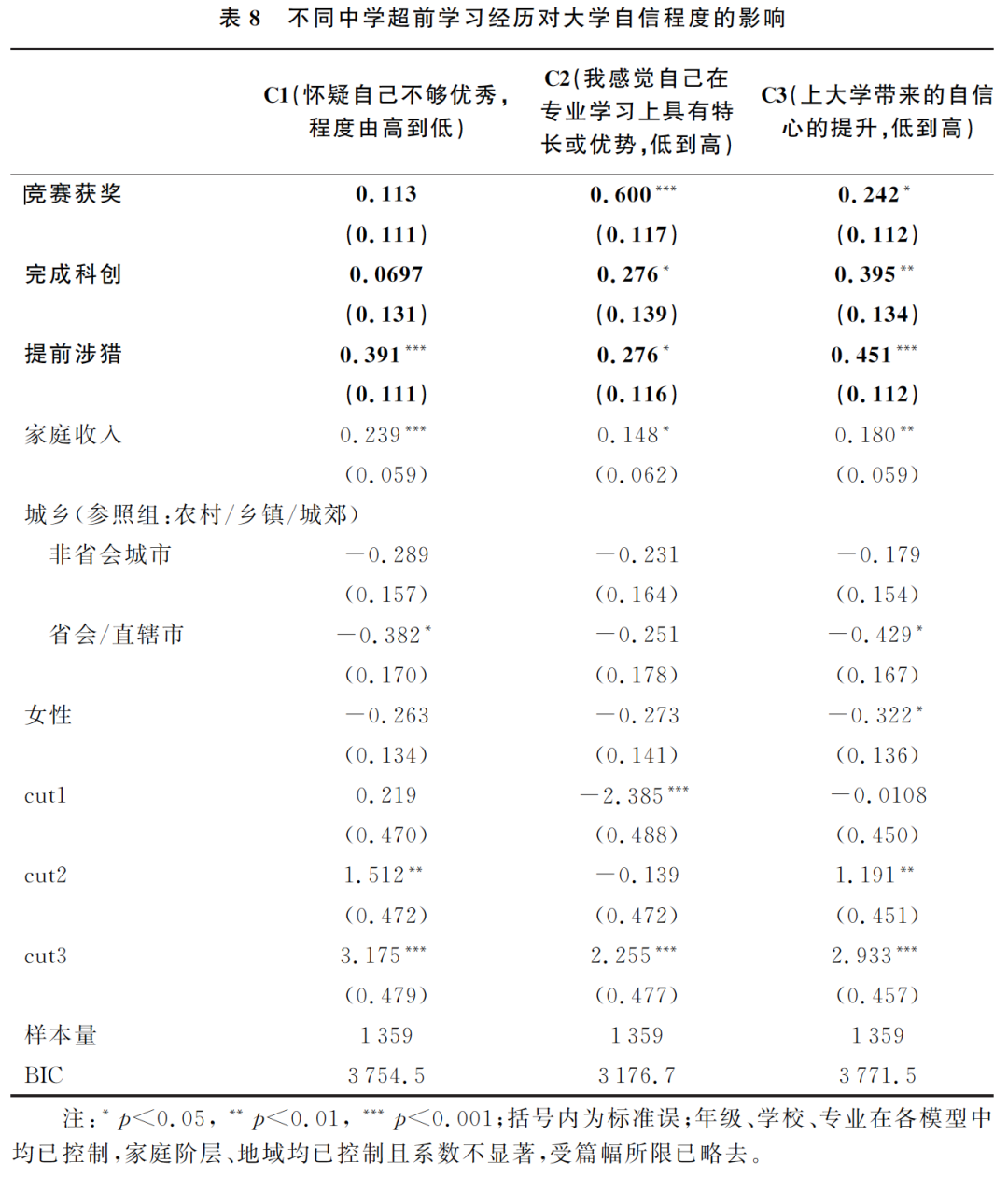 接下來是具有不同中學超前學習經歷的學生在自信方面的表現。如表8所示,因變量C1-C3均是類別數越大代表自信心越強。C1代表總體的自信程度,“提前涉獵”的學生相比未“提前涉獵”的學生總體自信程度更高,更堅信自己足夠優秀,而“競賽獲獎”與“完成科創”與否的差異不顯著。C2反映學生在專業學習上的優勢與信心,C3代表上大學以來自信心的提升程度。對於因變量C2和C3,比之沒有相應經歷的學生,擁有三種超前學習經歷的學生更能感覺到自己在專業學習上的優勢,上大學也為他們帶來了更多自信。尤其是,“競賽獲獎”學生相信自己在專業學習上有優勢特長,這種自信的發生比(本文中的“發生比”均指因變量處在更高級別相比更低級別的odds。如當因變量C2取值1~4代表同意程度從低到高四個等級時,“競賽獲獎”的學生選擇“非常同意”相比選擇“比較同意”“不太同意”或“不同意”的發生比是非“競賽獲獎”學生的e0.600倍;“競賽獲獎”的學生選擇“非常同意”“比較同意”相比“不太同意”“不同意”的發生比,以及選擇“非常同意”“比較同意”或“不太同意”相比選擇“不同意”的發生比同樣是非“競賽獲獎”學生的e0.600倍。受篇幅所限,下文在提及“發生比”時均採用簡化的表述,略去比較的對象)比非“競賽獲獎”學生高82%(即e0.600-1)。
