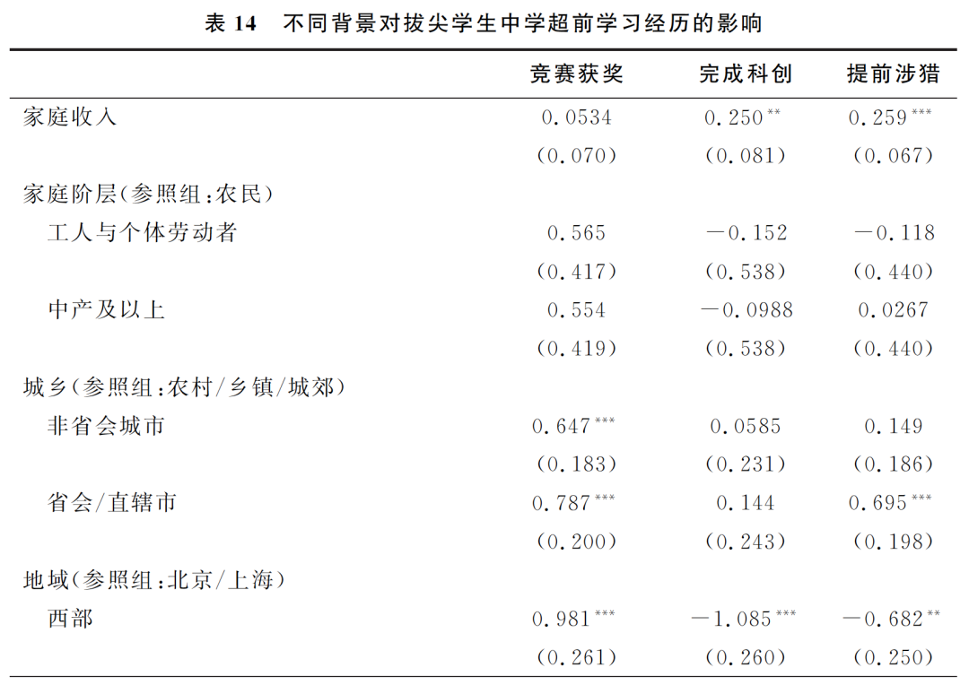 下文將通過控制變量的迴歸模型開展更精細的驗證(見表14)。首先,檢驗三類中學超前學習經歷與家庭經濟與階層的關係:在控制了其他變量之後,“競賽獲獎”“完成科創”與“提前涉獵”三個因素中,僅有“競賽獲獎”與家庭收入之間沒有顯著相關。家庭收入越高,學生擁有“完成科創”與“提前涉獵”經歷的可能性顯著越大。不過,三類超前學習經歷與家庭階層均沒有顯著關聯。