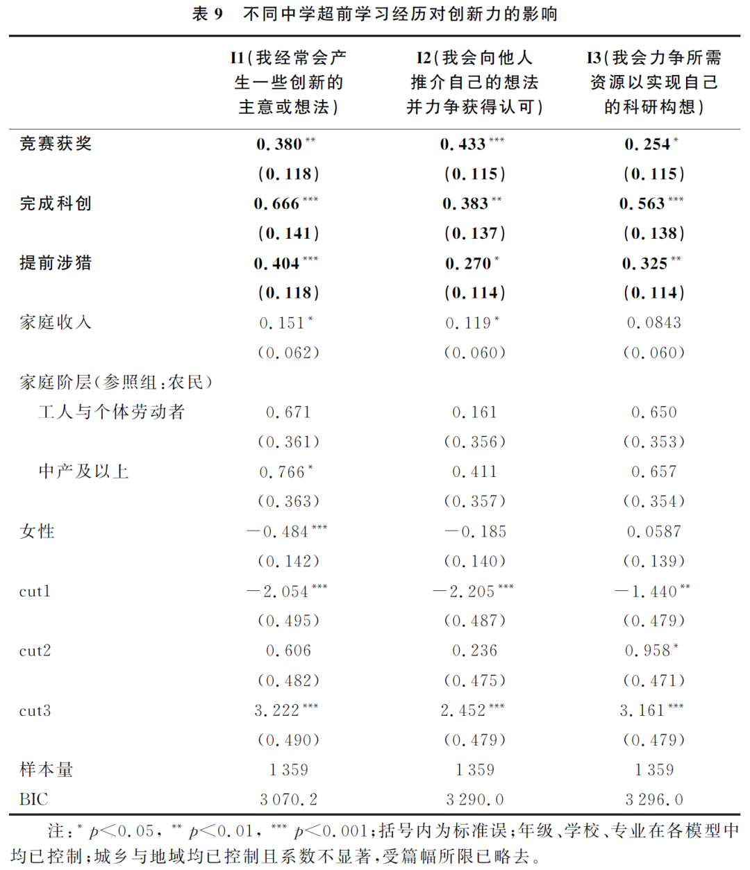 提出有價值的政策建議,不能忽視成本而架空地討論優質教育供給。本文發現,超前學習經歷與家庭經濟條件、地域因素相關。其中,只有“競賽獲獎”與家庭收入不相關,“完成科創”與“提前涉獵”都與家庭收入顯著正相關。