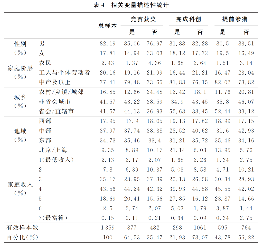 本文關注的三類中學超前學習經歷在問卷中分別使用三項表述來衡量,“我曾多次獲得奧林匹克競賽等學科競賽的省級或省級以上獎項”(本文將“競賽獲獎”界定為多次參賽並獲得省級以上獎項者。因為本文希望比較精確地識別出典型的“競賽生”,他們在中學期間花大量時間接受競賽訓練,爭取獲得省級以上獎項——能取得保送資格或在自主招生中有顯示度的獎項。現實中,這類學生通常會多次參加競賽、參加多項學科競賽,競賽經歷很大程度上影響到其中學教育。相應要剔除的是參賽但未能獲得省級以上獎項者,或者雖參加過競賽,但僅僅作為一次試練的機會,沒有針對性的訓練,不以取得較好競賽成績為目標的學生。不論是否獲獎,他們不會多次參賽,不屬於典型的“競賽生”)“我上大學前參與過科技創新類活動並完成項目”與“我所在的高中能提供與大學對接的講座、課程或實踐活動”。學生回答該表述是否與實際情況相符,“是”為1,“否”為0(下同),由此獲得三個虛擬變量,下文分別稱作“競賽獲獎”“完成科創”(近年來,為了在高校綜合招生面試中獲得更多優勢,家長、老師、校外培訓機構代替學生完成科創項目的“假科創”的現象頻頻出現,在樣本中應避免這種偏差。首先,樣本學生讀中學時,新高考改革中的綜合評價多元錄取政策尚未實施。其次,將“競賽獲獎”與“完成科創”兩個變量進行卡方檢驗發現,在p<0.001的水平上,二者顯著相關。再次,又將“完成科創”與“高中學習不費力”[二分變量]進行卡方檢驗,發現在p<0.05的水平上,二者顯著相關。這三條證據在一定程度上説明,本文樣本中完成科創的學生大都學有餘力,由學生本人在專家指導下親自完成科創的可信度較高)與“提前涉獵”(由於調查對象學生在高中均為學業優勢學生,如果高中能提供較稀缺的提前涉獵大學教育的資源或機會,他們通常會有資格得到,並且學生本人也在學業方面具有積極的參與態度,此處假定只要高中能提供這樣的機會,便代表調查對象學生有着“提前涉獵”的經歷。現實中,“提前涉獵”的學習機會多種多樣,較難量化,該變量無法表徵此類“提前涉獵”機會的質量和數量,也與校外的、家庭提供的“提前涉獵”機會無關)。此外,為了區分純粹出於升學目的走上競賽之路和真正對科學有興趣的競賽生,本文還設置了一個題項:“我中學/高中期間就對科學很感興趣”,由此得到一個二分虛擬變量“科學興趣”。
