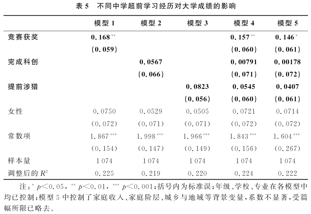 下文中所述自變量對因變量的影響並非是嚴格的因果推斷意義上的,而是指在其他變量取值不變的條件下,所關注的自變量取不同值帶來的因變量的改變。三類中學超前學習經歷與大學時學習成績的關係見表5。可以看到在五個模型的所有自變量中,僅有“競賽獲獎”這一項顯著影響大學成績。在增加了控制變量的情況下,雖然“競賽獲獎”的係數有所減弱,其作用部分地被其他因素所解釋,但是仍然正向顯著。在模型1中,中學時曾多次獲得學科競賽省級以上獎的學生到了大學後,其標準化後的績點比沒有“競賽獲獎”的學生顯著高0.168。模型4同時放入了“競賽獲獎”“完成科創”與“提前涉獵”,在控制了性別、年級、學校、專業以及中學“完成科創”“提前涉獵”的情況之後,“競賽獲獎”的學生大學標準化後的績點比非“競賽獲獎”的學生高0.157。模型5在模型4的基礎上控制了家庭背景與生源地情況,“競賽獲獎”的學生大學成績仍然顯著高於非“競賽獲獎”者。