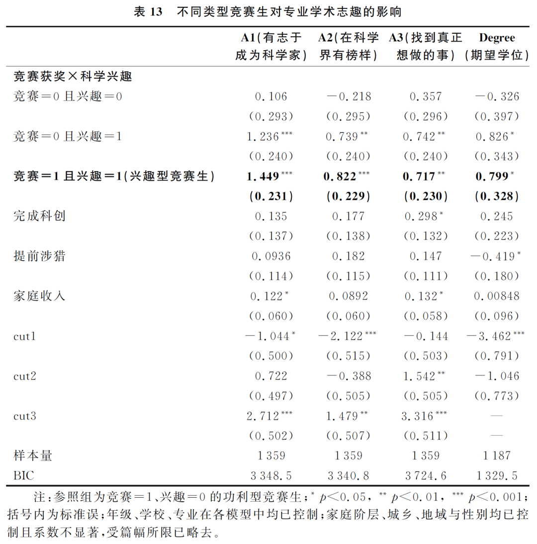 在專業學術志趣方面,表6的模型中“競賽獲獎”因素僅對A1變量顯著相關。但將功利型與興趣型的競賽生分開之後,如表13所示,在衡量專業學術志趣的四個變量上,興趣型競賽生都體現出更高的學術志趣。功利型與興趣型競賽生差別最大的一項是A1變量,興趣型競賽生有志於成為科學家、做出重要科技成就的程度更高,選擇更高(同意)級別的發生比是功利型競賽生的4.26倍(即e1.449)。計算邊際概率可得,當其他自變量都取均值時,興趣型競賽生“非常同意”與“同意”自己有志於成為科學家的概率分別為35.5%與44.6%,二者相加為80.1%;功利型競賽生相應的概率僅為11.4%與37.2%,相加後仍不足50%。此外,興趣型競賽生更加認同其在科學界或者專業領域有非常崇敬的學術榜樣,他們更多地找到了真正想做的事,也更渴望攻讀博士學位。在A2、A3與Degree這三個變量上,興趣型競賽生選擇更高(同意)級別的發生比都是功利型競賽生的2倍(即e0.717)以上。這些都説明,興趣型的競賽生有更明確、更高遠的學術志向。