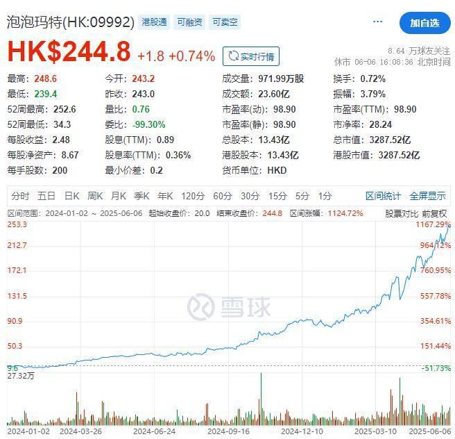 **Labubu的爆火,直接帶動了泡泡瑪特股價的飆升。**截至6月6日收盤,泡泡瑪特股價報244.8港元/股,總市值3287.52億港元,今年以來股價已上漲174%,從2024年初至今,漲幅更是超過了11倍。