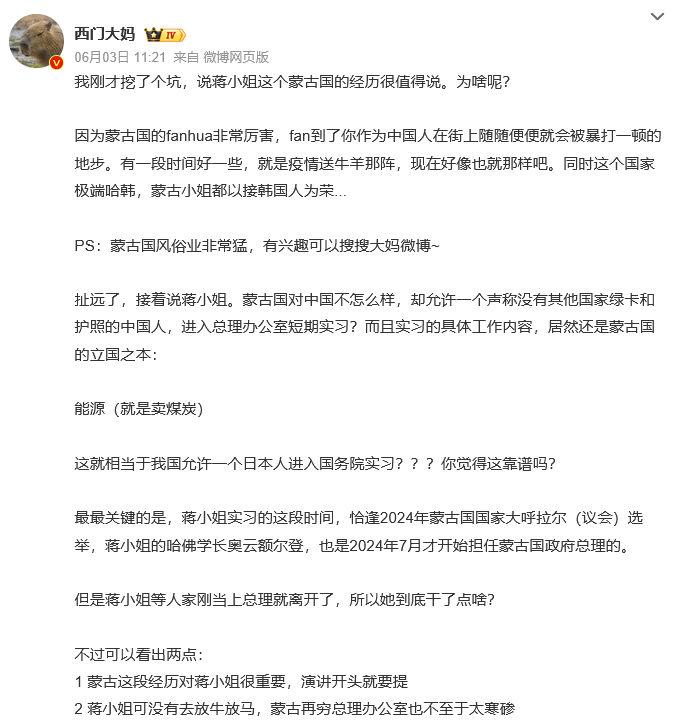 其實如果蔣小姐稍微能接點地氣,有點務實能力的話,身在美國應該會比國內的我們看得更清楚。可惜,就以她用自己加入美國在蒙古搞的NGO的資歷來回應網友質疑的水平,可能還真就“什麼都不知道”。
