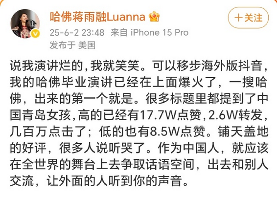 高考對階層固化的抑制只是一方面。像這次蔣小姐在哈佛,以及在網絡,在內外媒體上代表中國留學生,甚至代表中國人建設“人類命運共同體”,就牽扯出另一個重要問題,即哪個羣體才應該中國的主體,是本土做題家以及各行各業的勞動羣眾,還是權貴富豪階層的二代世界公民?