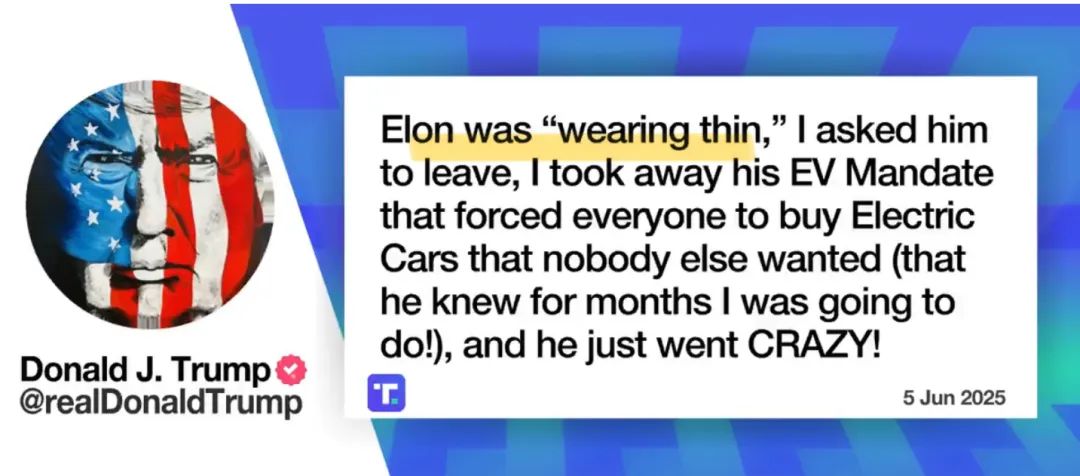 “分手”後,特朗普罵馬斯克“瘋了”,馬斯克罵特朗普“忘恩負義”。備受中外媒體引述的,是特朗普5日發佈的推文: