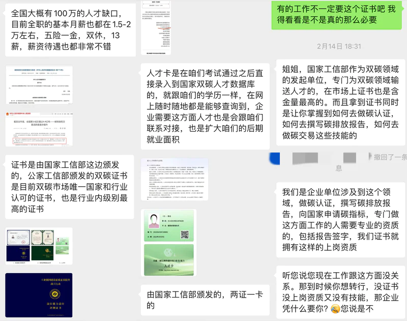 銷售人員頻繁發送的推銷信息中,“報考工信體系雙碳證書”優惠力度不小。而為了打消學員疑慮,宣稱“在服務期內,考試不通過,無條件全額退費,報名0風險。”