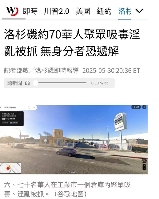 時間再往前看,在2025年5月30日凌晨洛杉磯縣工業市一家倉庫,有爆料30多名來自台灣和香港的華人涉嫌聚眾吸毒、淫亂被抓。被捕的華人中,有身分者被關押在艾爾蒙地市警察局,沒有身分的已被送往洛杉磯聯邦關押地。