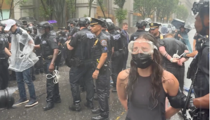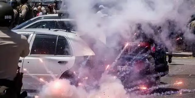 緊接着有戴黑口罩的年輕人留下"A"字標記,據稱事Antifa成員的活躍分子讓洛杉磯被硝煙遮蔽:石塊與催淚瓦斯橫飛的五小時裏,至少八名特勤人員送醫,十二輛政府公務車遭焚燬。