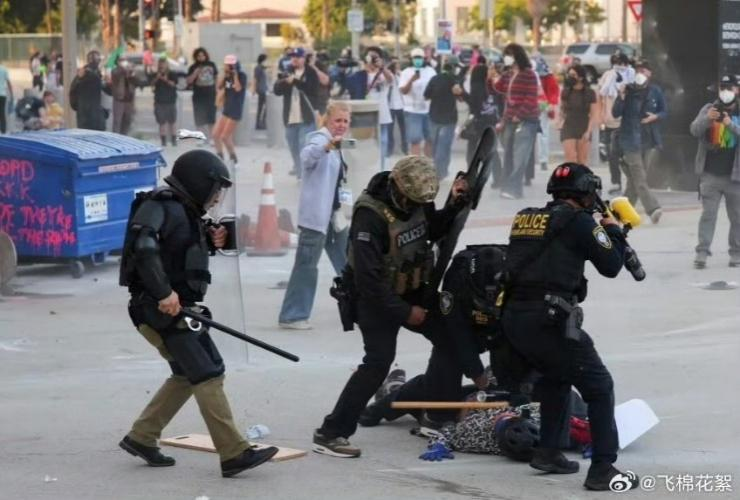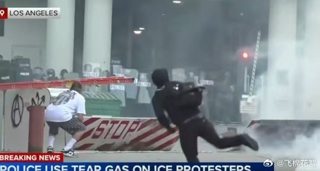 現場的視頻和圖片稱洛杉磯有約500名抗議者聚集在洛杉磯市中心,正試圖闖入關押移民的洛杉磯聯邦拘留中心,身着防暴裝備的警察使用催淚瓦斯。