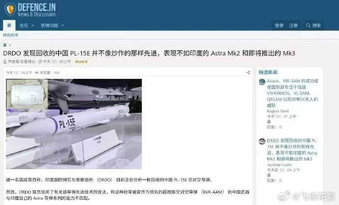 與此同時印度國防研究與發展組織(DRDO)目前正在分析一枚收的中國-15E 空對空導彈,DRDO官員駁斥了有關該導彈先進技術的説法,稱這種經常被傳為領先的超視距空對空導彈PL15並不先進,表現不如印度的“阿斯特拉 MK2”導彈和即將推出的“阿斯特拉 MK3”。印度甚至指責這次空戰會輸主要是法國提供的戰機和空空導彈不行。