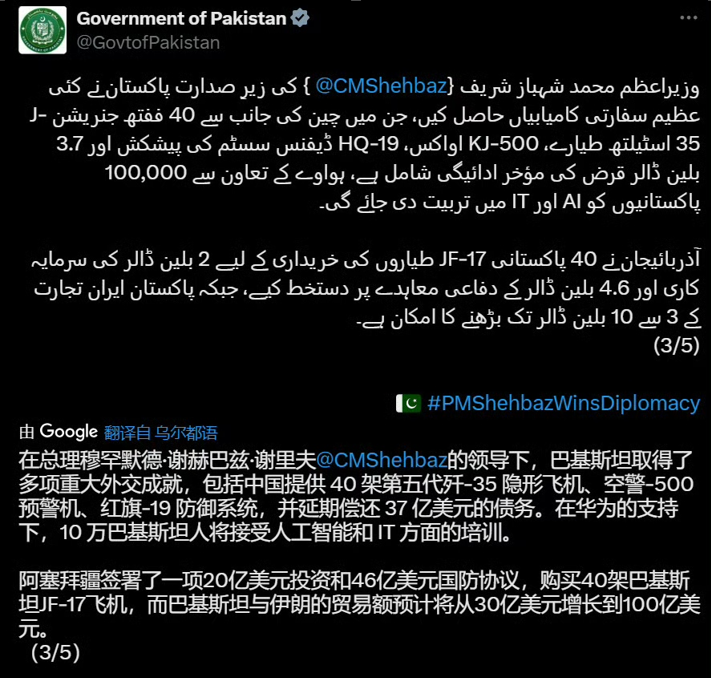 巴基斯坦官方賬户稱在總理謝里夫的領導下,巴基斯坦取得了多項重大外交成就,包括中國提供 40 架第五代殲-35 隱形飛機、空警-500預警機、紅旗-19 防禦系統,並延期償還 37 億美元的債務。在華為的支持下,10萬巴基斯坦人將接受人工智能和T方面的培訓。阿塞拜疆簽署了一項20億美元投資和46億美元國防協議,購買40架巴基斯坦JF-17飛機(“梟龍”戰機),而巴基斯坦與伊朗的貿易額預計將從30億美元增長到100億美元。