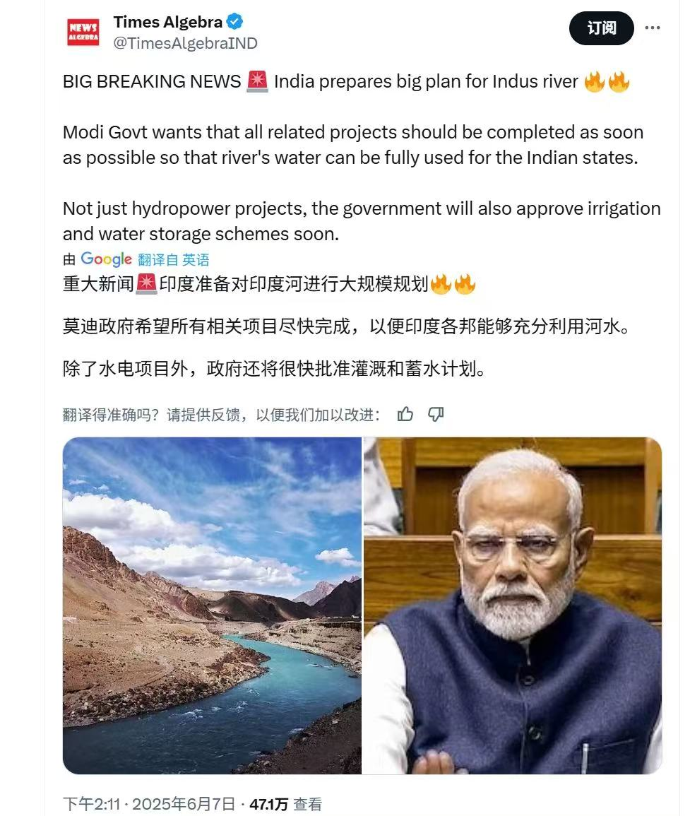 印度據稱準備對印度河進行大規模規劃,增加灌溉和蓄水計劃。這個是官方話,棉花絮翻譯成通俗的話就是印度要把印度河流域上流的水截流,然後灌溉印度的農田,不給巴基斯坦使用。聯想到印度多次警告中國別在雅魯藏布江上游建水壩和截流,懂得都懂。