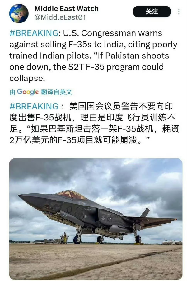 之前為了應對俄羅斯向印度出口蘇-57,特朗普曾於年初表示:“我們將增加對印度的軍售,金額達數十億美元。我們也在為最終向印度提供F-35隱形戰鬥機鋪平道路。” 但有美國國會議員警告不要向印度出售F-35戰機,理由是印度飛行員訓練不足。“如果巴基斯坦擊落一架F-35戰機,耗資2萬億美元的F-35項目就可能崩潰。”