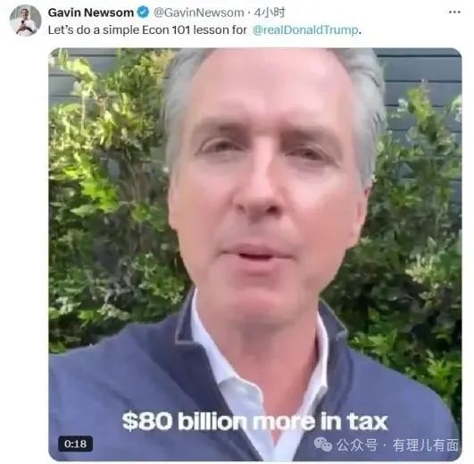 面對特朗普的步步緊逼,紐森的反擊既直接又犀利。他在社交媒體上發佈視頻,要給特朗普“上一堂簡單的經濟學入門課”。