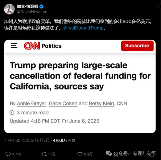 據報道,特朗普政府計劃大規模削減對加州的聯邦資金。此消息一出,紐森立即在社交媒體上發起反擊並@特朗普:“加州人為聯邦政府買單。我們繳納的税款比我們收到的多出800多億美元。也許是時候停止這種做法了。”