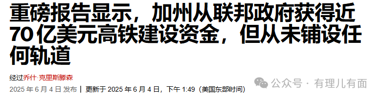 6月4日,美國交通部長肖恩·達菲發佈310頁報告,痛批加州高鐵管理局“15年花費近70億美元卻沒有鋪設哪怕一英尺軌道”,威脅要撤銷加州高鐵項目40億美元聯邦撥款。