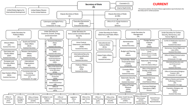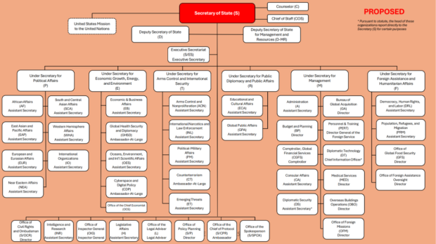 備忘錄設立了權力強大的“副部長”,其中一個職位現在負責控制政治軍事事務局、反恐、國際禁毒和新成立的新興威脅部門。美國國際開發署的傳統獨立性也遭到破壞。其職能被併入一位新的對外援助和人道主義事務副部長的領導下。