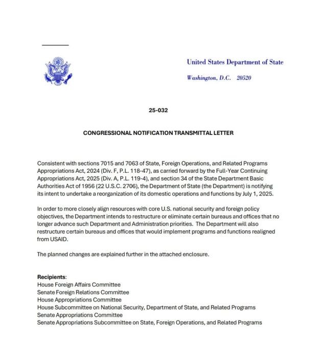 五月初,一份敏感的國務院備忘錄開始在國會山的專門委員會中流傳。這份名為“國會備忘錄25-032”的備忘錄概述了美國外交使團的徹底重組,將取消許多長期與美國相關的項目,包括對言論自由、婦女權利和文化交流的支持。儘管其範圍廣泛,包括裁撤100多個辦事處和數千個工作崗位,但根據《Drop Site》的調查,只找到了一位看過這份備忘錄的美國國會議員。