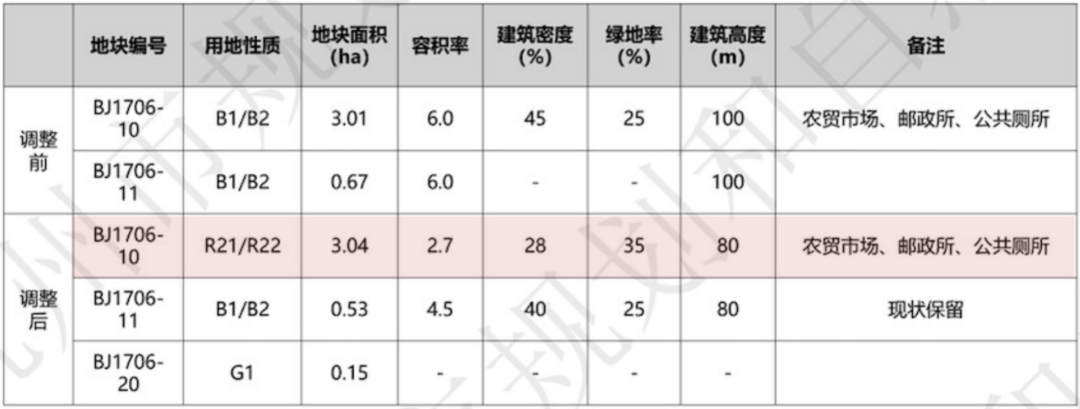 包括地塊面積、容積率從6.0到2.7、建築密度從45%下降至28%,綠地率也來到從25%提升到35%,限高80米