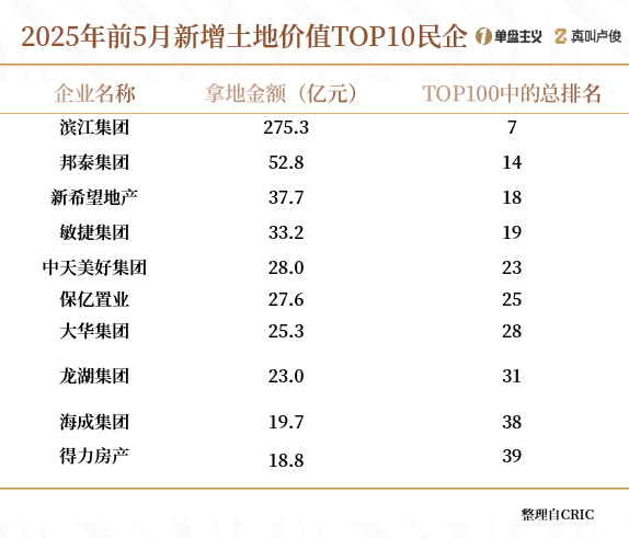 克而瑞公佈的前5月房企新增貨值排行榜中,拿地金額百強中有接近三成民企現身