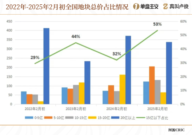 據統計,今年2月初,全國超過五成的地塊總售價在15億以下