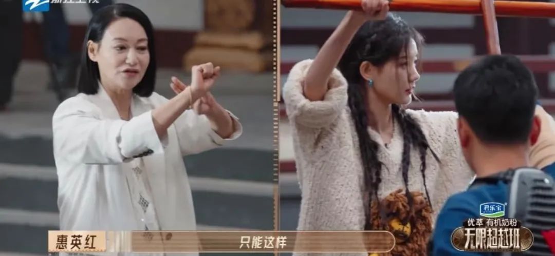 惠英紅的嚴厲則帶着香港電影黃金時代的印記。在指導李一桐吊威亞拍攝《神鵰俠侶》片段時,她盯着監視器反覆喊停,細究其動作規範。當有學員膝蓋淤青請求休息時,她卻嚴厲回應:“當年我在邵氏拍跳樓戲,斷了三根肋骨照樣接着拍,觀眾不會關心你疼不疼,只關心你像不像角色。”