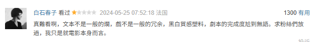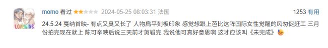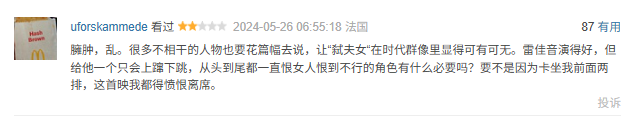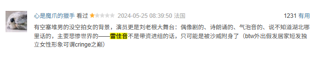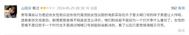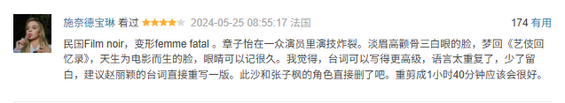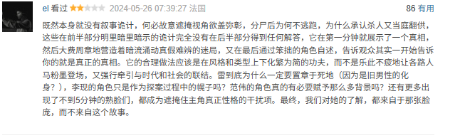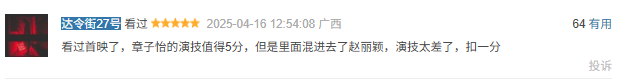 更棘手的是片中扎堆的男性角色,他們分散了敍事焦點,無形中削弱了本應作為核心的女性羣像塑造,還有好多人説雷佳音才是主角,宣傳卻主打章子怡大女主,使得影片“女性敍事”的宣言顯得根基不穩。