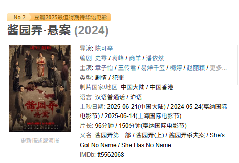 《醬園弄》無疑是她演藝生涯中關鍵的一場戰役。當豆瓣2025最值得期待華語電影榜單上它赫然位列第二,這份沉重的期待化作無形的壓力。