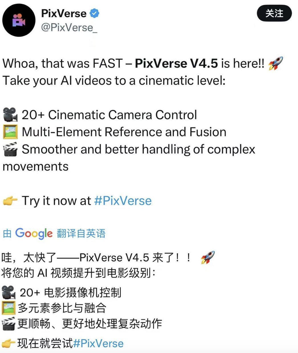 當下,AI工具迭代速度是相當驚人的。以“PixVerse”為例——V1版本的上線時間是24年1月,V2版本是7月,然後保持着近2個月迭代一次的速度,而到現在,已經來到4.5版本。在這個過程中,許多過去天馬行空的創意都能被低成本、低門檻的實現。