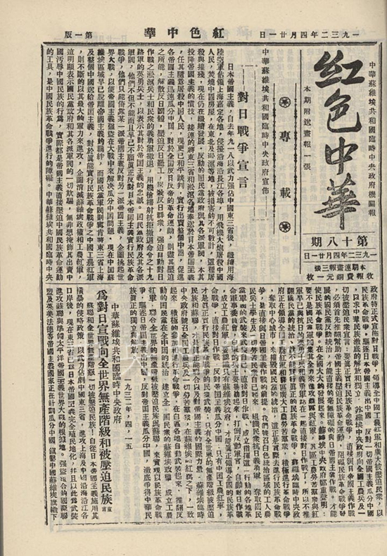 ▲1932年4月15日,中華蘇維埃共和國臨時中央政府宣佈《對日戰爭宣言》。