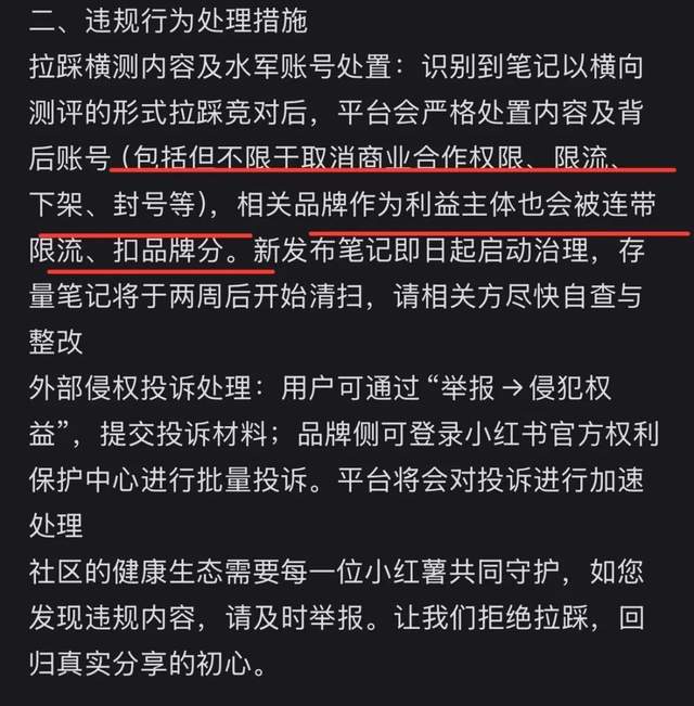 小紅書表示,一旦識別到筆記以橫向測評的形式拉踩競對,平台將採取嚴格的處置措施,不僅會對相關內容進行清理,還會對背後賬號進行處理,包括但不限於取消商業合作權限、限流、下架、封號等。同時,相關品牌作為利益主體也將受到連帶處罰,面臨限流、扣品牌分等後果。