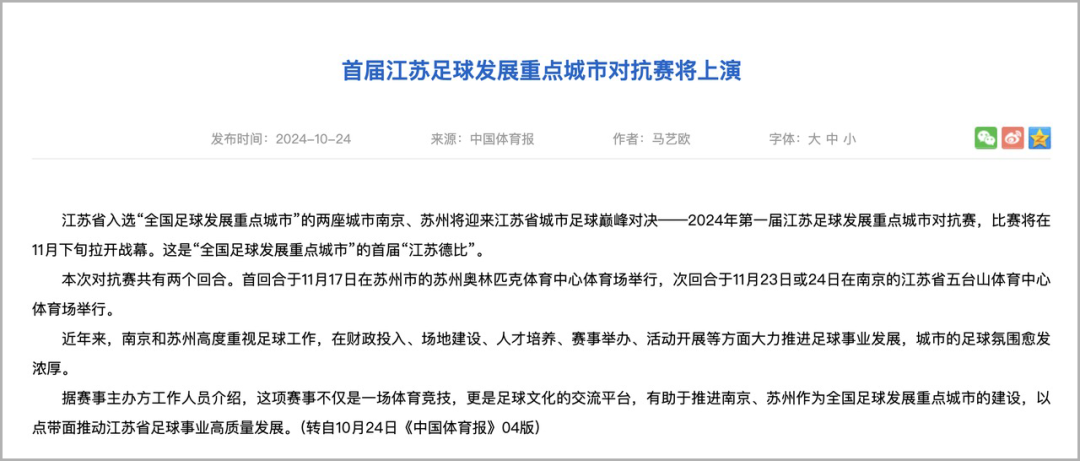 去年 10 月底,國家體育總局官網轉自中國體育報新聞説南京和蘇州要來一場江蘇足球發展重點城市對抗賽,其中還提到了這兩城市在財政投入、場地建設、人才培養、賽事舉辦、活動開展等方面對足球事業大力支持。