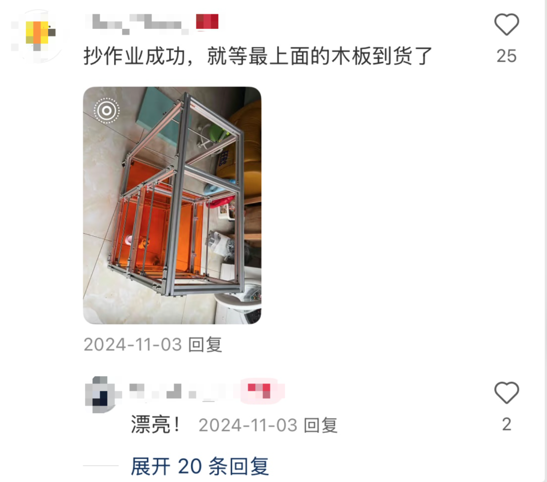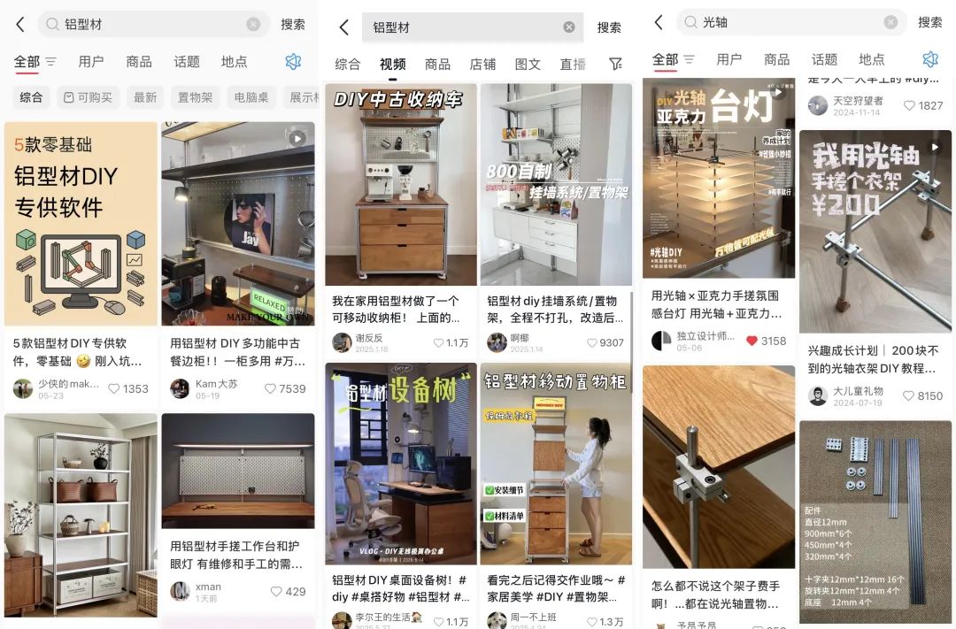 最近,一股以**“鋁型材”、“海洋板”、“直線光軸”、“亞克力”**等工業標準件為製作材料的DIY熱潮,正在風靡各大內容社區,從小紅書到抖音再到B站,愛好者們以不同的方式展示自己或得意或翻車的作品、分享製作心得,在算法推薦機制下吸引着一批又一批成年人入坑,走上一條標準件DIY的“不歸路”。