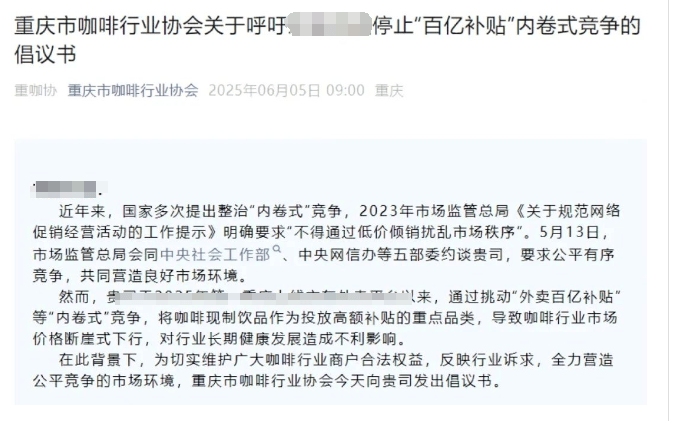 各地的獨立咖啡館受到了極大的衝擊。6月5日,重慶市咖啡行業協會發出一份倡議書,直指外賣平台發出“百億補貼”是“內卷式競爭”,要求立即“停手”。