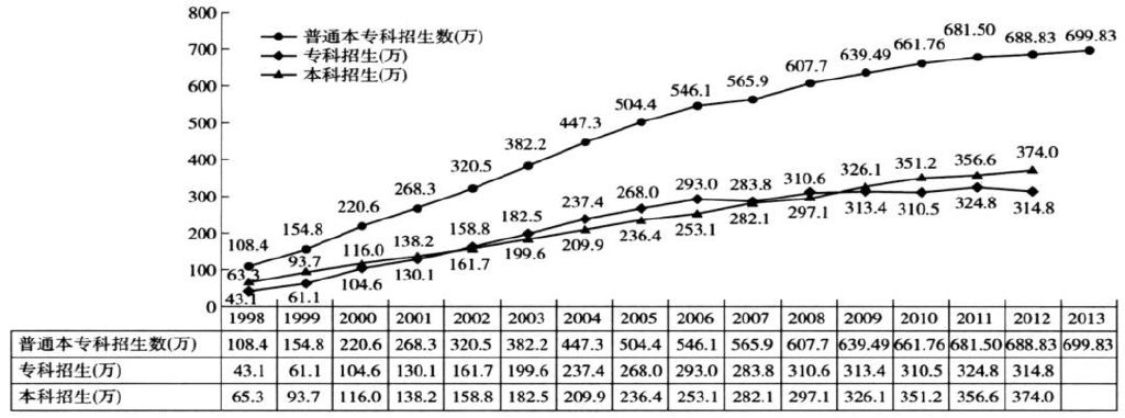 中國高等教育的擴招始於1999年,據教育部發布的數據,1990年,高等教育毛入學率為3.40%,擴招前的1997年毛入學率9.10%,1998年為9.80%,1998年本專科招生數108.4萬,2013年,本專科招生數為699.83萬,高等教育毛入學率已達34.50%;其中,2002年,高等教育入學率已達到15.00%,已達到數字意義上的大眾高等教育。1990年,高中升高等教育入學率為27.30%,2002年這一數據為83.50%,2012年,高中入高等教育入學率87.00%。