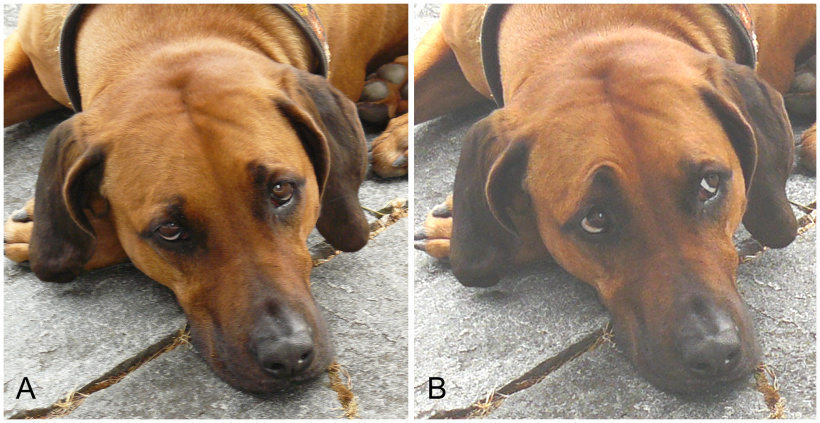 圖3. 家養犬的面部活動——內眉提升示例,增加了眼眶(眼睛)的高度和整體尺寸:A)臉部右側中性,B)臉部右側的內眉提升 | 圖源:參考文獻[3]