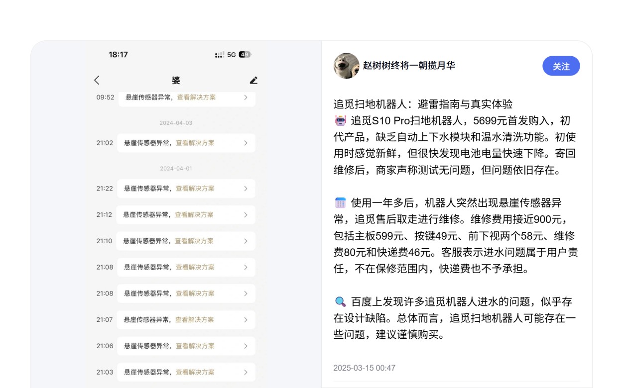 此外新品的頻發推出,單品方面的測試時間亦有縮水,或間接影響了產品的品控成果。3·15期間,有用户反映追覓S10pro掃地機器人使用一年多後,出現懸崖傳感器異常的問題,5699元首發購入的機器,維修費用接近900元。還有其他用户反映機器人存在進水的情況,似乎存在設計缺陷。