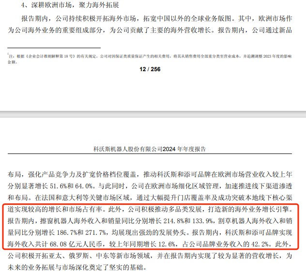 已經上市的科沃斯則可以被視為“智能派”,通過“科沃斯”與“添可”兩大品牌全面佈局洗地機、擦窗機、割草機器人等細分品類。財報顯示,科沃斯2024年擦窗機器人海外收入和銷量同比分別增長214.8%和133.9%,割草機器人海外收入和銷量同比分別增長186.7%和 271.7%。
