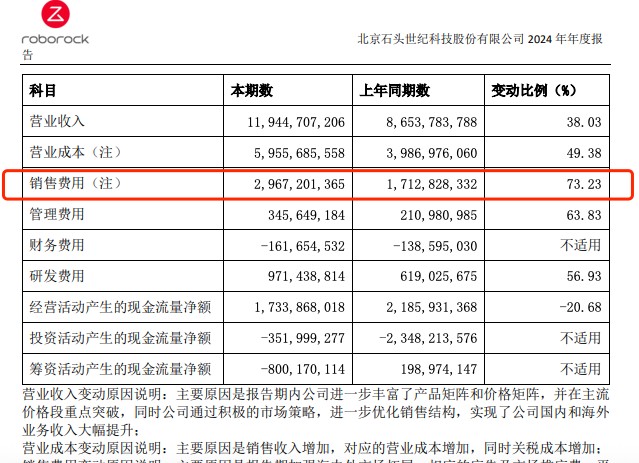 科沃斯2024年銷售費用達50.17億元,佔165.42億元總營收的比例超過30%;石頭科技2024年銷售費用為29.67億元,同比激增73.23%,主要原因為報告期加強海內外市場拓展,相應的廣告及市場推廣費、平台服務費以及佣金費用增加。