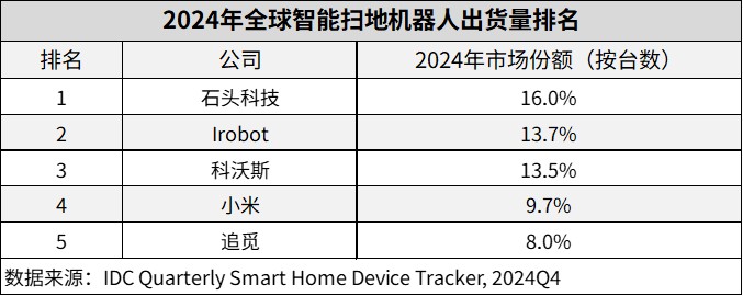 據IDC《全球智能家居設備市場季度跟蹤報告(2024年第四季度)》數據顯示,全球智能掃地機器人按出貨量進行的市場份額排名中,除了第二名iRobot,其餘四家石頭科技、科沃斯、小米和追覓均為中國企業,並分別以16.0%、13.5%、9.7%和8.0%的份額位列前五。
