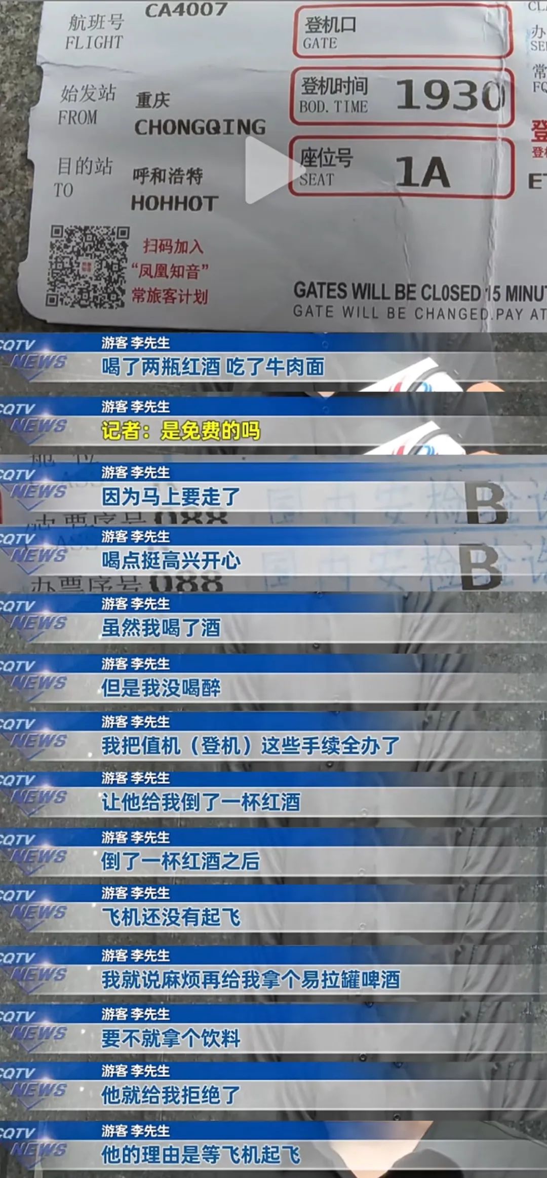 是説一旅客花了700多買了國航重慶飛呼和浩特的公務艙機票,在休息室喝了兩瓶紅酒,上飛機又跟乘務員要,乘務員倒了一杯給他後,他還要啤酒。