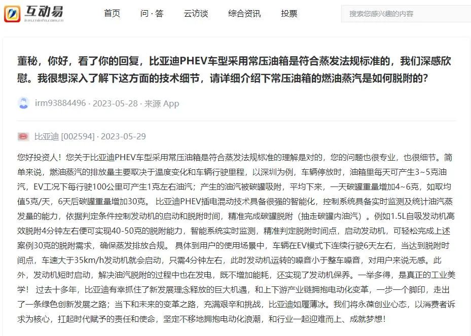 但這個回應,針對的是金融問題,而不是“常壓油箱”問題。比亞迪的“常壓油箱”到底有沒有問題?還是要等監管方給一個定論。否則,比亞迪的這場輿論仗,是打不完的。