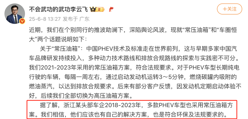 為什麼吉利這麼有底氣?根源就在於,長城舉報屬實!這一點,比亞迪也承認了,確實用了常壓油箱。比亞迪品牌及公關總經理李雲飛也承認了,但是呢,李雲飛暗指“浙江某車企”,在同一時期,也使用了常壓油箱。這個“浙江某車企”,説的就是吉利了。