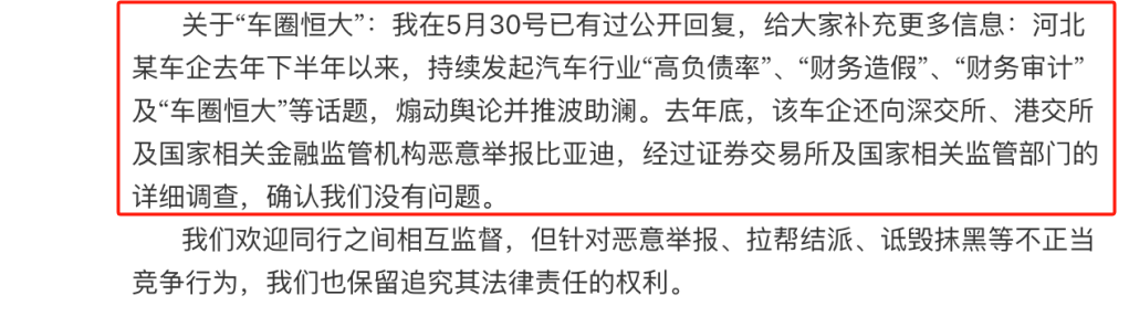 李雲飛還特意爆料,“河北某車企”不但舉報了比亞迪“常壓油箱”問題,還在深交所、港交所以及國家相關金融監管部門,惡意舉報了比亞迪。但比亞迪經過調查後,確認沒有問題。