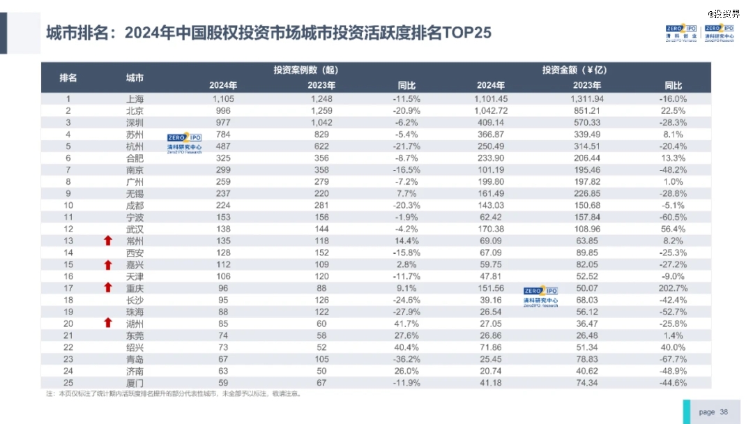 清科研究中心數據顯示,在2024年中國股權投資市場投資地區分佈中,江蘇以1603起案例居於首位。其中,蘇州投資活躍度僅次於上海、北京、深圳;而在一眾江蘇城市中,無錫、常州投資活躍度僅次於省會南京,“太湖三霸”稱號並不誇張。
