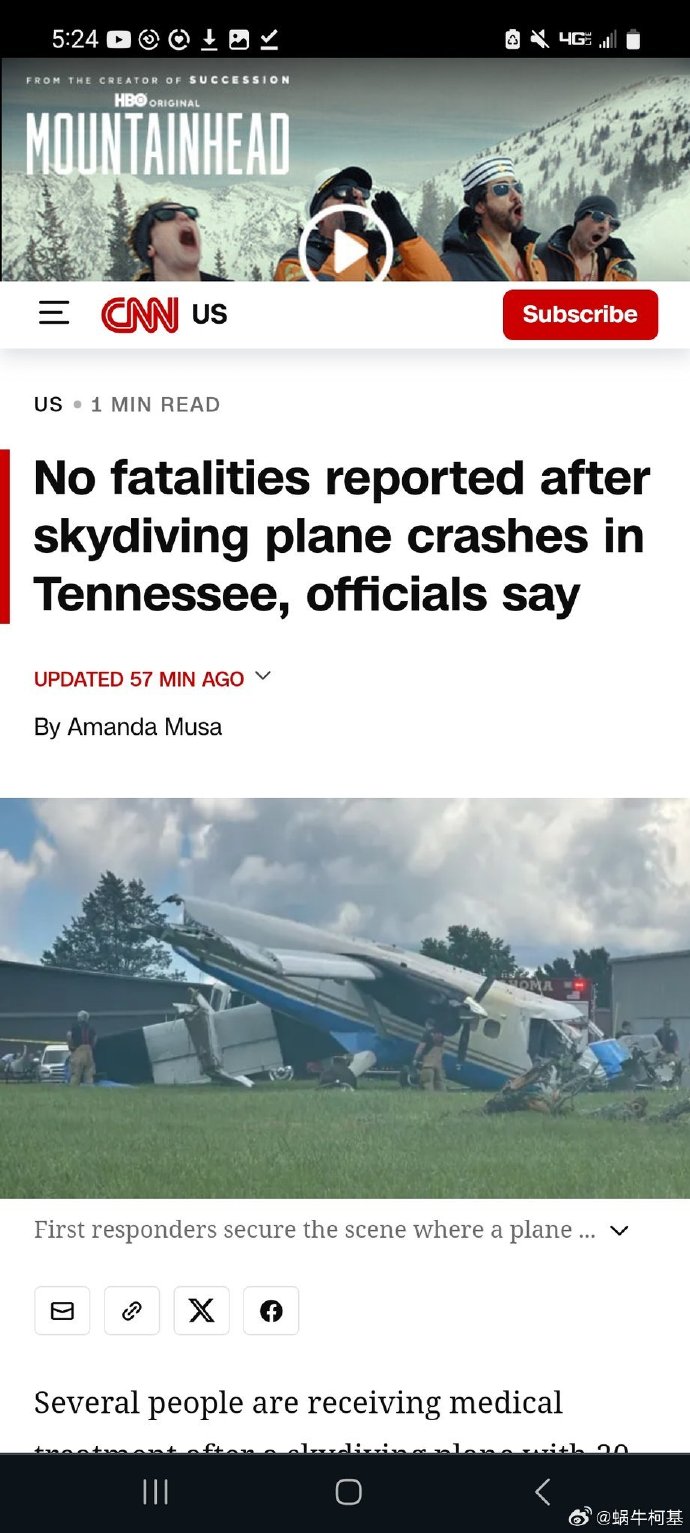 一架加拿大德哈維蘭 DHC-6-100 雙水獺跳傘飛機(N166DH)在美國田納西州塔拉霍馬墜毀,機上20名乘客全部倖存,多人受傷 。